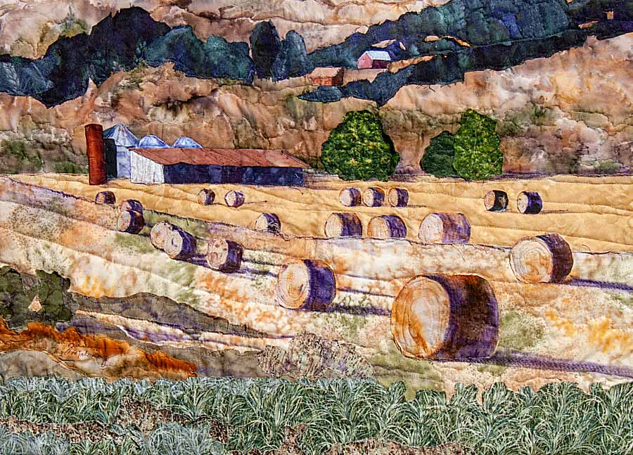 JM: In one photo that inspired me, I liked the strong play of light and shadow on the hay bales and on the barn this fall day in Yamhill, Oregon. There are wonderful late afternoon shadows playing across the fields. The harvest golds were mesmerizing. But in the photo the eye is confused by the bales scattered about so randomly. For my composition I rearranged the hay bales to lead the eye back to the focal point—the main barn and silos. I eliminated some of the buildings detracting from the focal point to simplify the composition.
